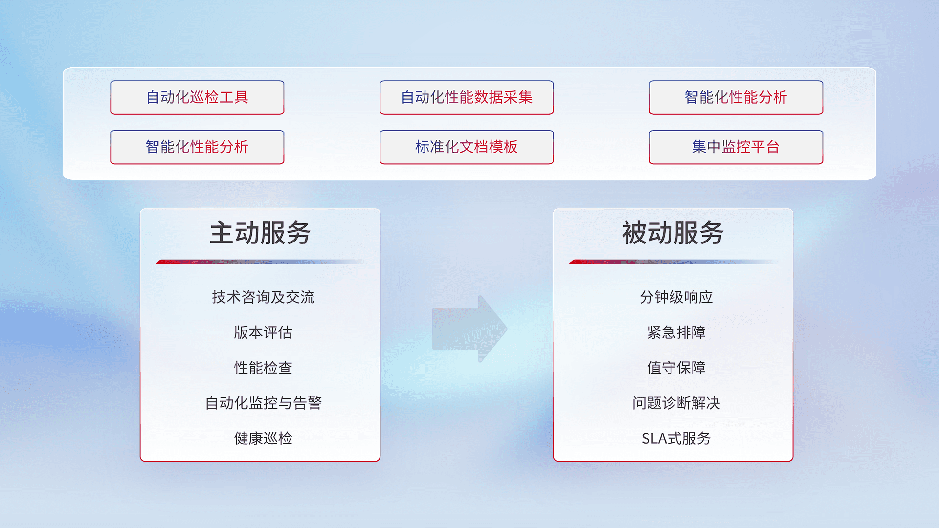 智能化工具和标准化文档,,,,保障服务质量,,提供主动服务(包含技术咨询、、版本评估、、性能检查、、、、自动化监控与告警、、、健康巡检)和被动服务包含(分钟级响应、、紧急排障、、、值守保障、、、、问题诊断解决、、、、SLA服务)。。。。